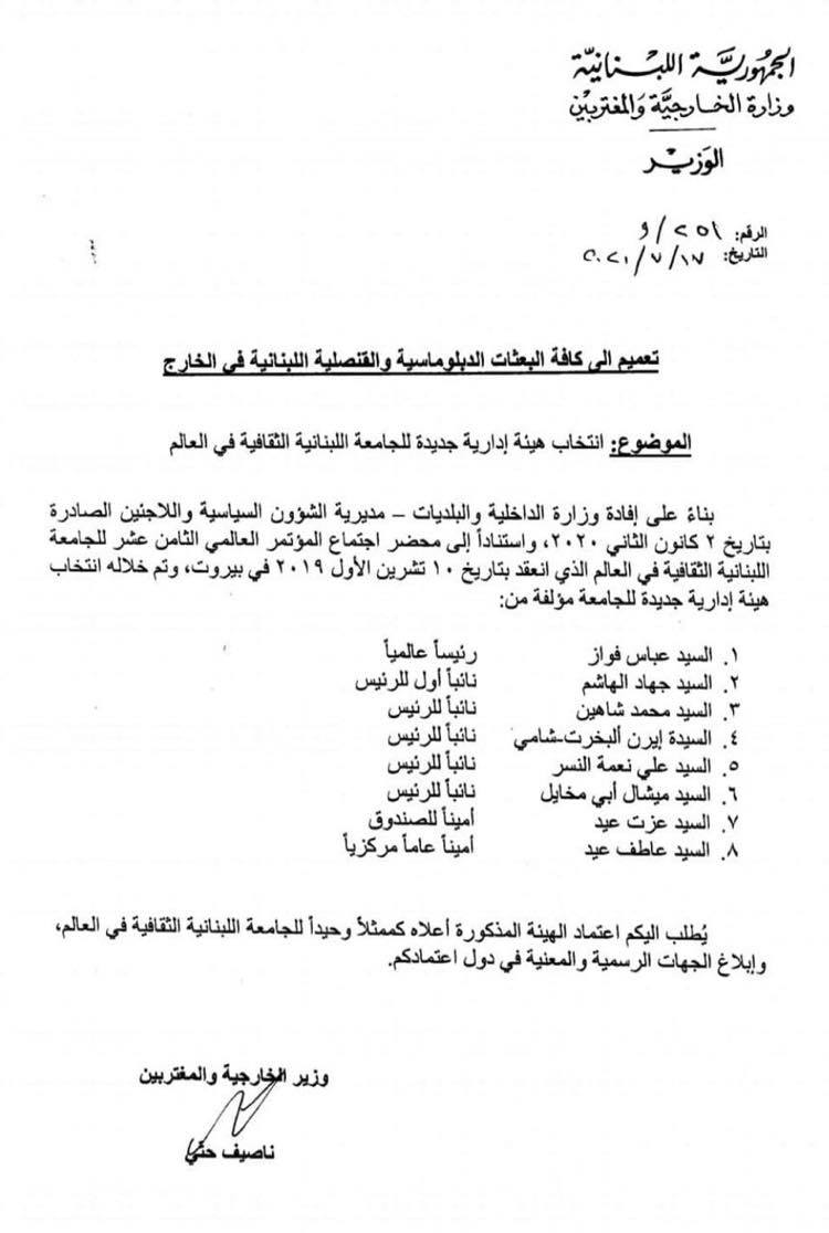 في خطوة رآها كثير من المعنيين سكيناً جديداً في خاصرة الاغتراب وخطوة غير مفهومة في توقيتها وأهدافها، أصدر وزير الخارجية والمغتربين ناصيف حتي أمس (الجمعة) تعميماً إلى "البعثات الديبلوماسية والقنصلية اللبنانية كافة في الخارج، يطلب اليهم إعتماد الهيئة إلإدارية للجامعة اللبنانية الثقافية في العالم - التي يرأسها عباس فواز- ممثلاً وحيداً للجامعة.