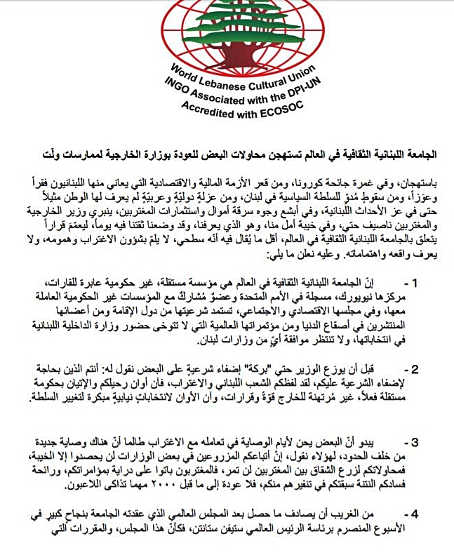 واستغرب بيان الجامعة إقدام وزير الخارجية على هذه الخطوة بعد البيانات الأخيرة التي أصدرتها الجامعة "وبعد العمل الدولي الوطني الدؤوب الذي تقوم به في الأمم المتحدة وفي دول القرار بحق الفاسدين وسارقي أموال اللبنانيين، وبعد إعلانها تأييدها لثورة ١٧ تشرين، ومطالبتها المستمرة برفع يد الوصاية عن لبنان".