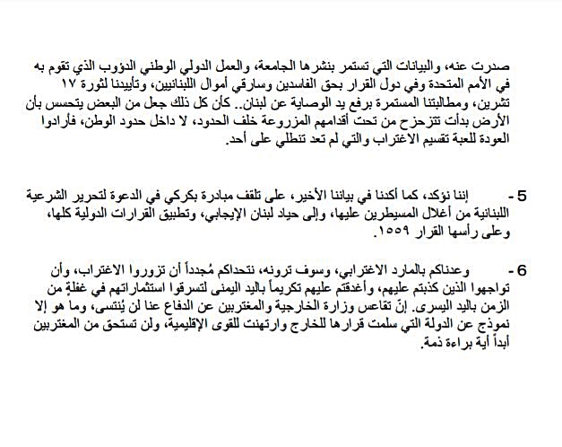 وجاء في البيان: "يبدو أنّ البعض يحن لأيام الوصاية في تعامله مع الاغتراب طالما أنّ هناك وصاية جديدة من خلف الحدود، لهؤلاء نقول، إنّ أتباعكم المزروعين في بعض الوزارات لن يحصدوا إلا الخيبة (...) وقبل أن يوزع الوزير حتي "بركة" إضفاء شرعيةٍ على البعض، نقول له: أنتم الذين بحاجة لإضفاء الشرعية عليكم، لقد لفظكم الشعب اللبناني والاغتراب، فآن أوان رحيلكم والإتيان بحكومة مستقلة فعلاً، غير مُرتهنة للخارج قوّةً وقرارات، وآن الأوان لانتخاباتٍ نيابيةٍ مبكرة لتغيير السلطة".