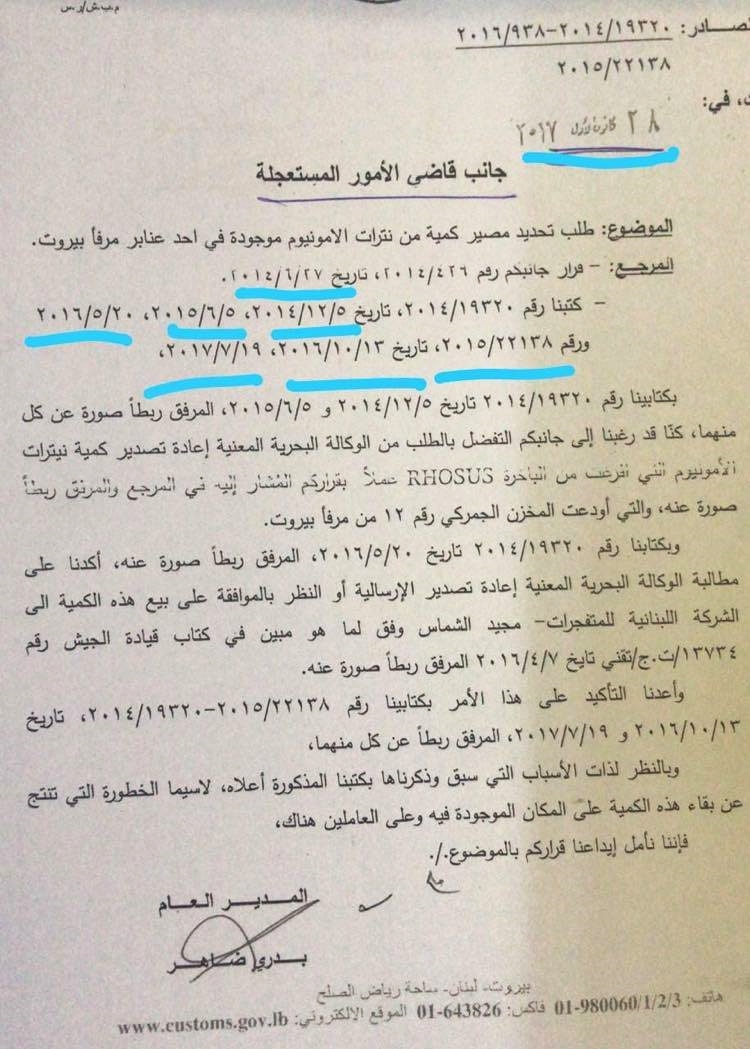 وأمس، جرى التداول عبر وسائل التواصل الاجتماعي بنسخة عن كتاب رفعه المدير العام للجمارك بدري ضاهر لقاضي الأمور المستعجلة طالباً تحديد مصير كمية من نترات الأمونيوم الموجودة في أحد عنابر مرفأ بيروت. وهذه نسخة عنه: