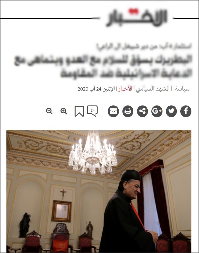 إن إتهام صاحب الغبطة بالتماهي مع العدو والدعاية الاسرائيلية ضد "المقاومة"، هو إتهام مرفوض ومردود لأصحابه، وبدلاً من توجيه الاتهامات جزافاً الى صاحب الغبطة الذي لا تشكيك بصحة معلوماته، ننصح الصحيفة بالتدقيق والاستقصاء عمّن يخزّن الاسلحة والمتفجّرات في الاحياء السكنية وبين المدنيين لأنه هو نفسه مَن يتماهى مع العدو، ويستخدم المدنيين الابرياء دروعاً بشرية في حروبه ويستدرج العدو لقصف هذه الاحياء وإيقاع الضحايا البريئة والدمار والخسائر الجسيمة، وفيما ننتظر نتائج التحقيق في كارثة الانفجار في مرفأ بيروت، نستغرب هذا الهلع من التحقيق الدولي وكأن هناك اشياء يودّ البعض التعمية عليها في ظل شكوك بتلاعب في مسرح الجريمة تماماً كما حصل بعد اغتيال الرئيس الشهيد رفيق الحريري.