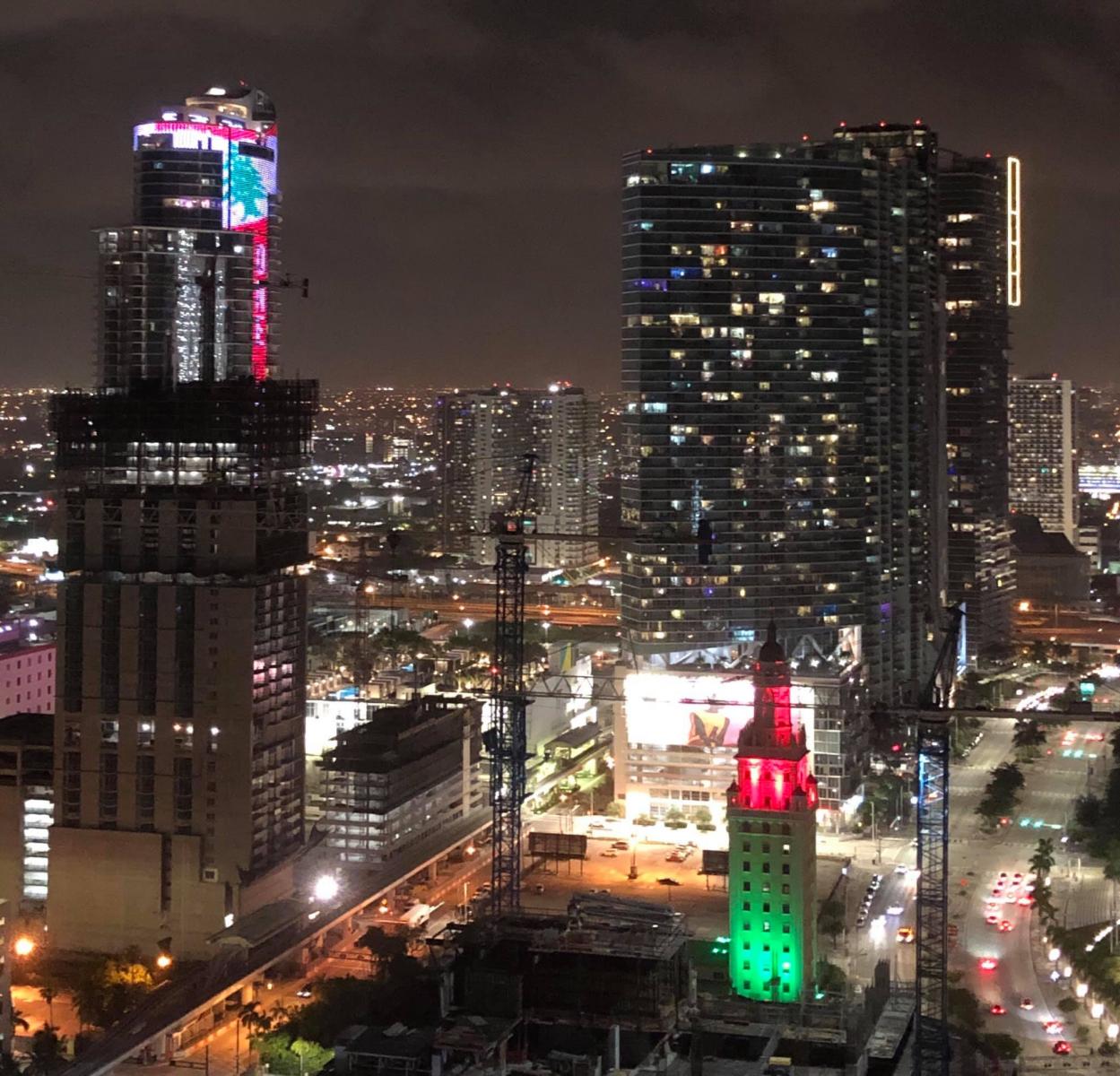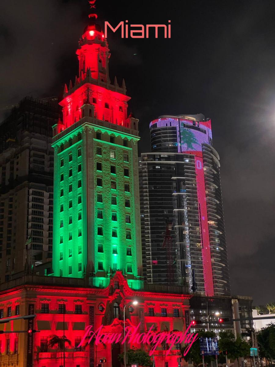 ومن المباني والمواقع التي أضيئت ليلة أمس مبنى "باراماونت وورلد سنتر" و"فريدوم تاور" التاريخي ومجمع "ميامي تاورز" السياحي وإحدى الحدائق العامة وسط المدينة. وهذه بعض اللقطات بعدسة المصور جوزيف عون:
