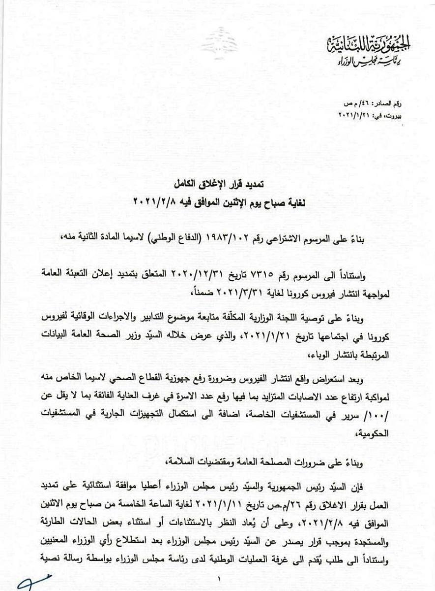 وفي ظل استمرار تسجيل أرقام قياسية يومية بعدد الإصابات والوفيات، أعلنت رئاسة مجلس الوزراء اليوم عن تمديد قرار الإغلاق العام ومنع التجول حتى 8 شباط المقبل. وهذا نص البيان:
