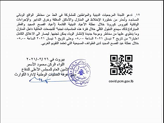 تفادياً لتفشي وباء كورونا في عطلة عيد الفصح، قررت غرفة العمليات الوطنية لإدارة الكوارث إغلاق البلد بشكل كامل من السبت الثالث من نيسان حتى صباح الثلاثاء في السادس من نيسان مع فرض منع التجول وطلب اذونات للتحرك عبر المنصة الخاصة. وجاء في البيان الآتي: