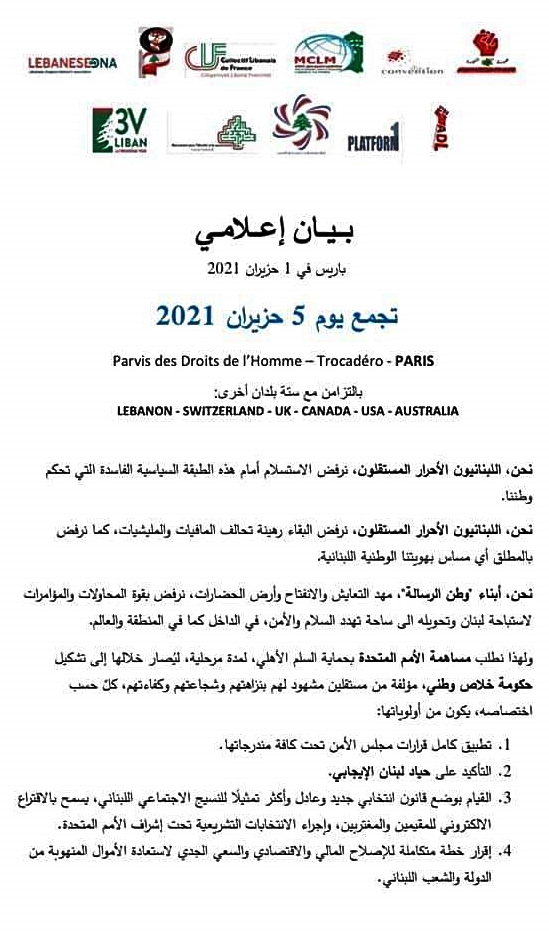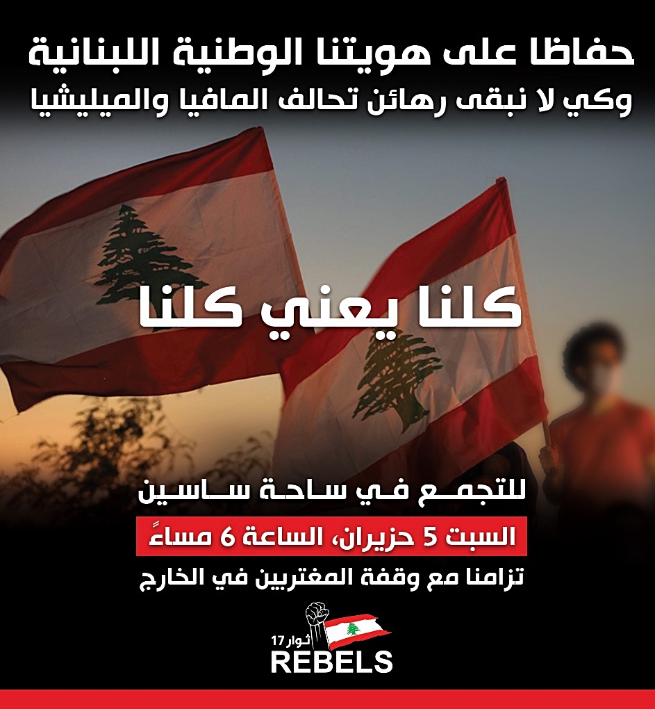 دعا عدد من مجموعات الثورة في لبنان ودول الانتشار إلى المشاركة في وقفات احتجاجية ستجري يوم السبت المقبل في 5 حزيران عند السادسة 6 مساء بتوقيت بيروت لرفع الصوت ضد الطبقة الفاسدة التي تحكم لبنان والتي أودت به إلى الظروف الاقتصادية والمعيشية المزرية التي يرزح تحتها المواطنون منذ ما يزيد على سنة.