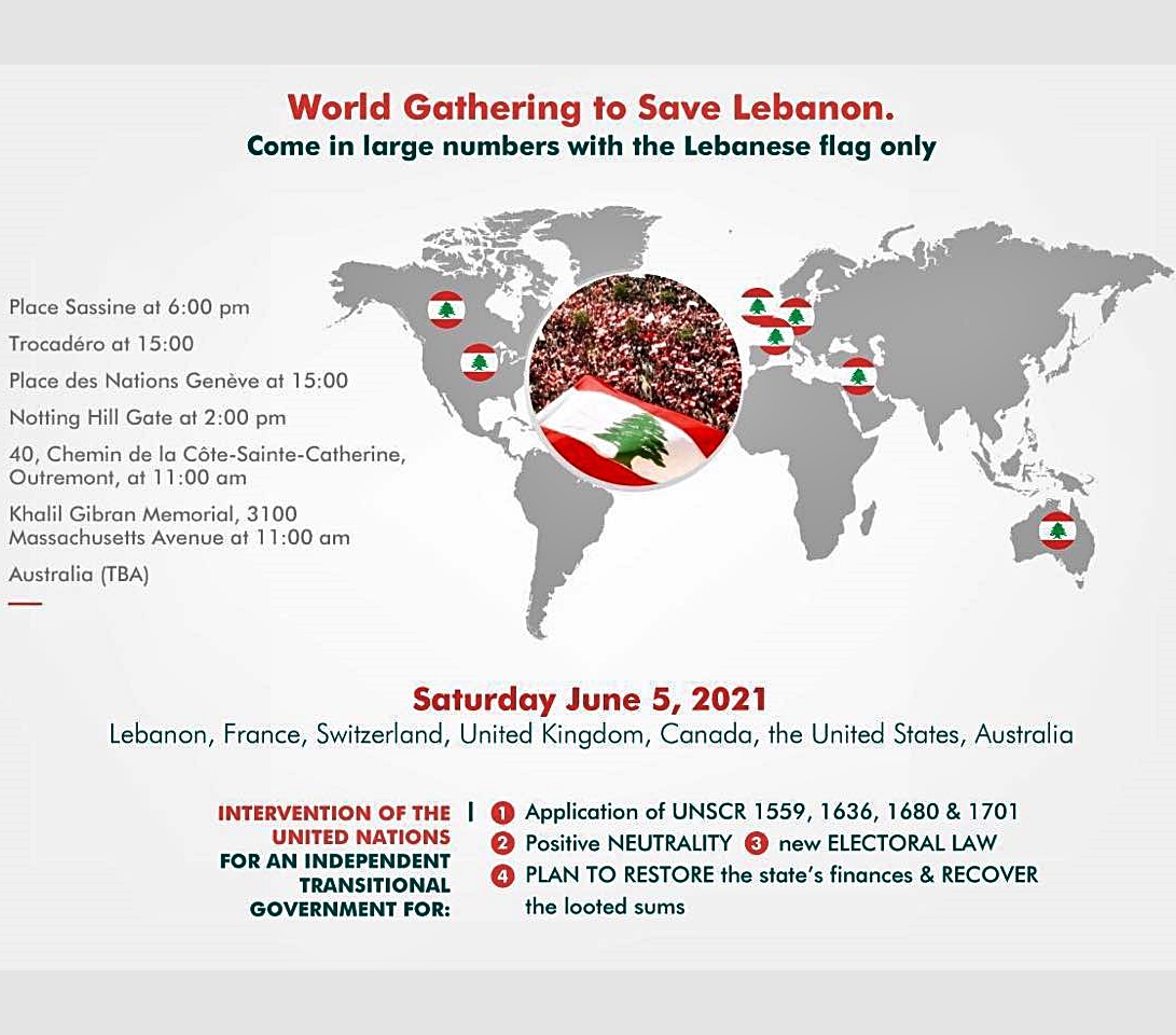 التجمع المركزي سيكون في ساحة ساسين في الأشرفية وسيتزامن مع تجمعات واعتصامات ستجري في ساحة تروكاديرو في باريس وتجمعات أخرى في كل من سويسرا (Place Des Nations – Geneve) وبريطانيا (Notting Hill Gate) والولايات المتحدة (أمام نصب جبران خليل جبران في بوسطن، ماساتشوستس) وكذلك في الارجنتين وأستراليا.