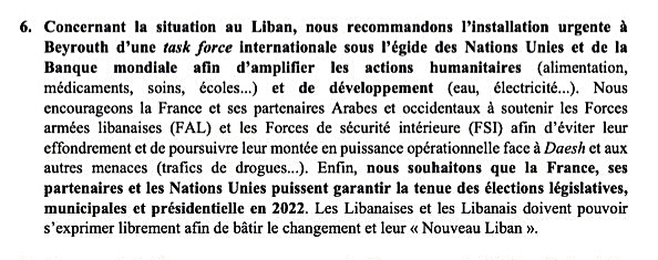 ونص البند السادس في توصيات لجنة الدفاع الفرنسية والمؤرخ في 6 تموز على إرسال قوات دولية الى لبنان بشكل طارئ تحت سلطة الأمم المتحدة والبنك الدولي في سبيل تعزيز الأعمال الإنسانية ومساعدة اللبنانيين، ودعم الجيش اللبناني والقوى الأمنية لحفظ الأمن والإستقرار.