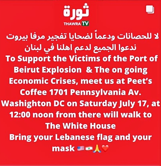 دعماً لأهالي ضحايا تفجير مرفا بيروت ولمطلب رفع الحصانة عن المسؤولين المطلوبين للتحقيق من قبل القاضي طارق بيطار، ينظم ناشطون لبنانيون في العاصمة الأميركية واشنطن مسيرة ظهر السبت 17 تموز تنطلق من أمام Peet’s Coffee في شارع Pennsylvania Avenueلتتوجه من هناك نحو البيت الأبيض. وسيحمل المشاركون الأعلام اللبنانية ويافطات كتب عليها شعار Lebanese Lives Matter.